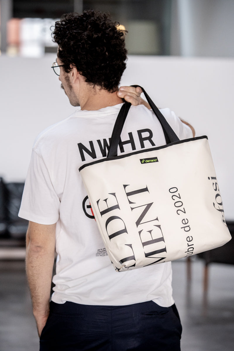 Está confeccionada con lona (PVC) de banderola que sirvió para difundir celebraciones y eventos especiales de la ciudad de Barcelona. Es impermeable, durable y súper resistente.