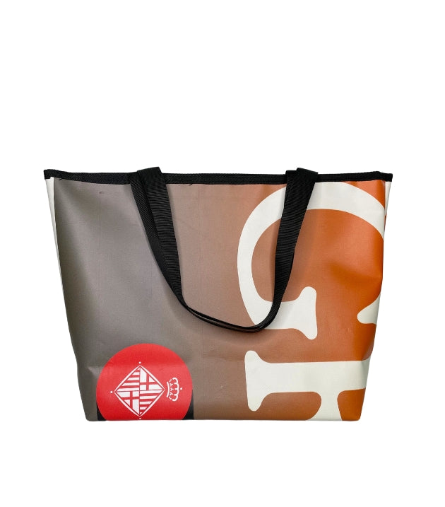 Cometa de kitesurf reutilizada que ha surcado mares y cielos. Asas de algodón y cremallera de nailon. Forro interior repelente al agua.
