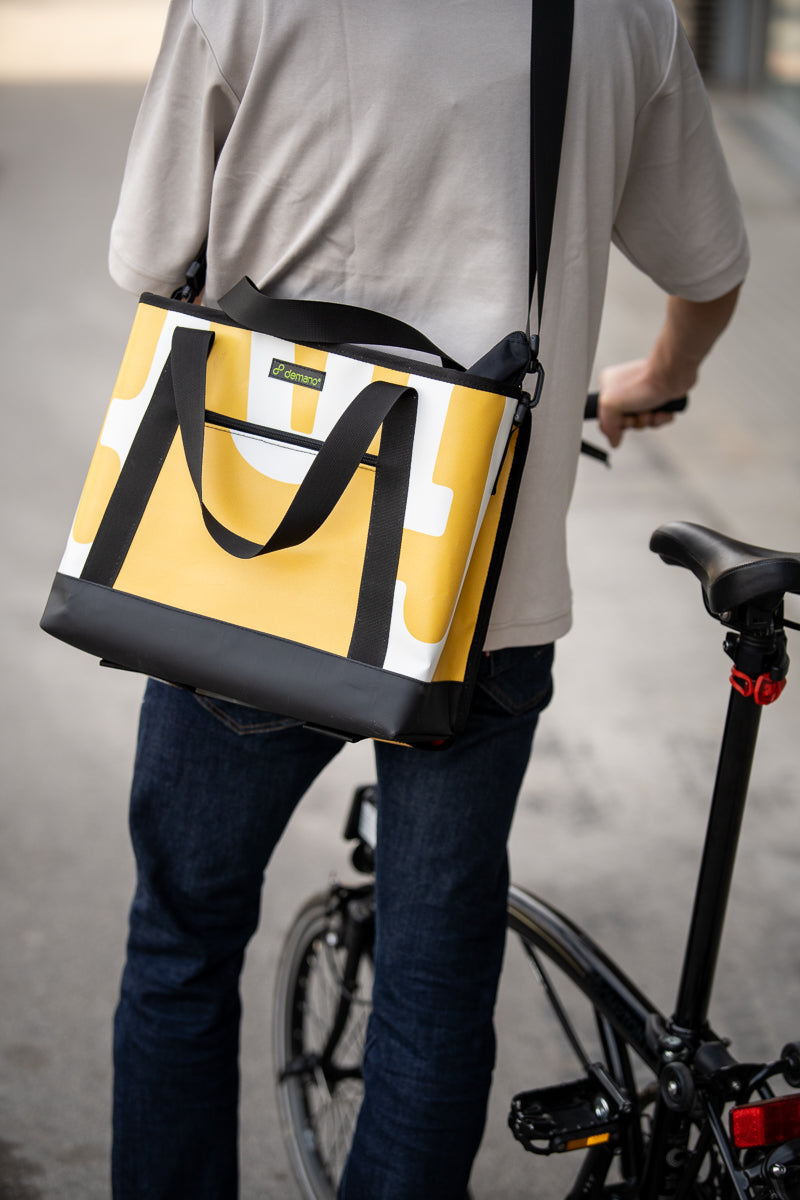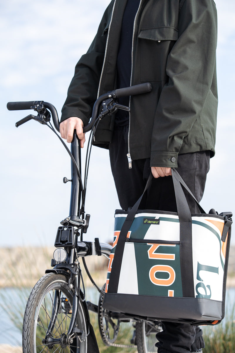 Hecha de lonas recicladas de eventos de Barcelona, ICARIA L se adapta a manillares Brompton y Vello o se lleva al hombro. Con espacio para un portátil de hasta 15", múltiples bolsillos y marco extraíble, es perfecta para el ritmo urbano.