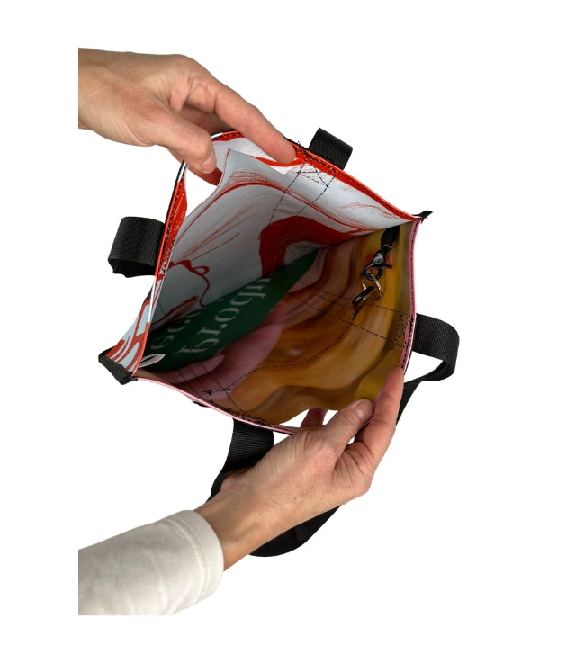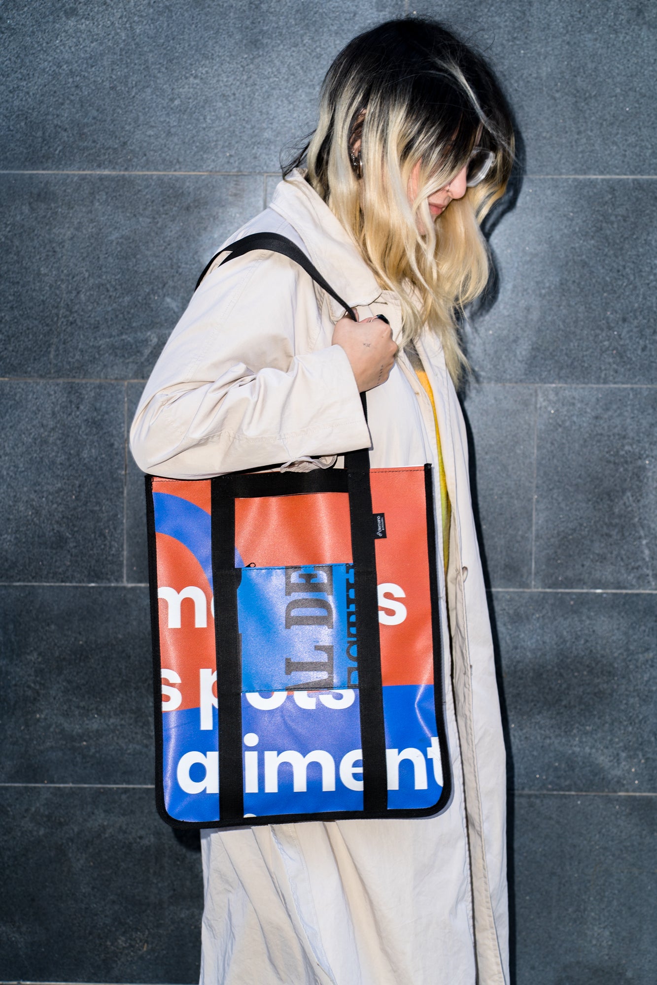 Esta bolsa de hombro plana ha sido confeccionada a mano en Barcelona a partir de lonas publicitarias recicladas, convirtiéndose en una pieza única e irrepetible.