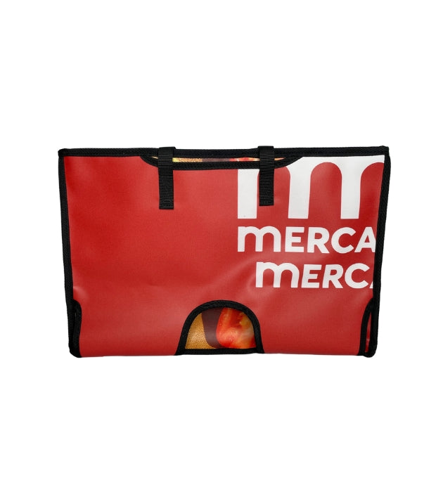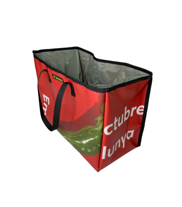 Está confeccionada con lona (PVC) de banderola que sirvió para difundir celebraciones y eventos especiales de la ciudad de Barcelona. Es impermeable, durable y súper resistente.