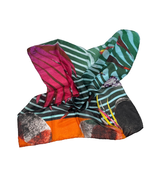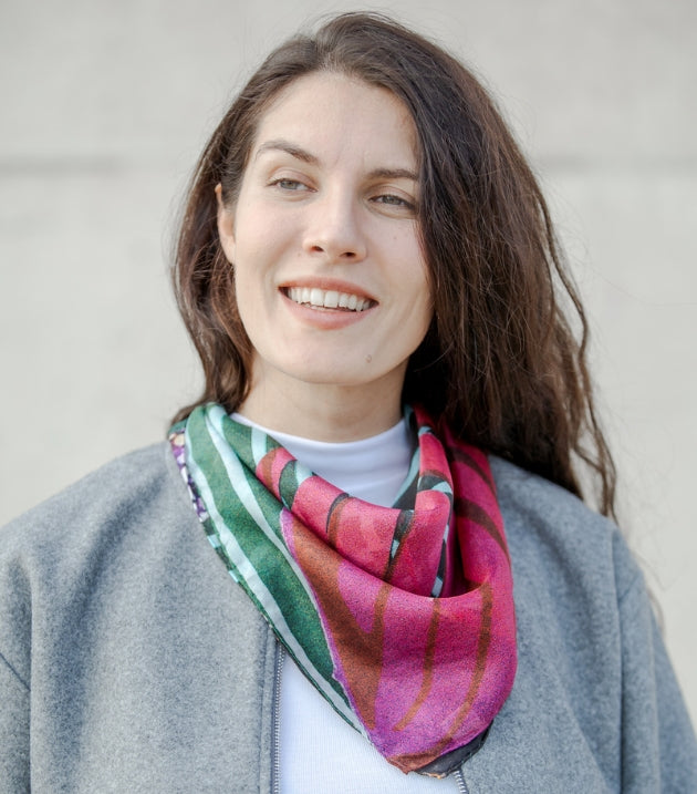 Para compartir esa historia con más personas, convertimos esos collages en diseños impresos digitalmente sobre seda de alta calidad.