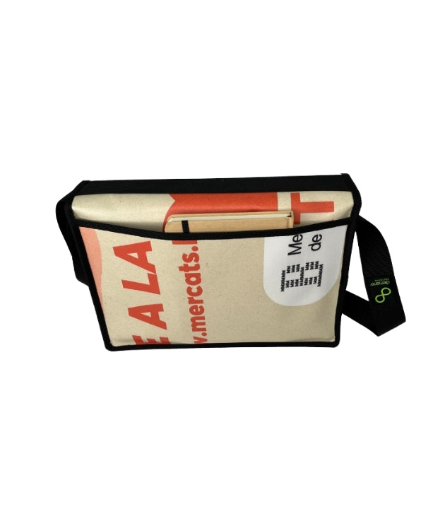 Está confeccionado con lona (PVC) de banderola que sirvió para difundir celebraciones y eventos especiales de la ciudad de Barcelona. Es impermeable, durable y super resistente.