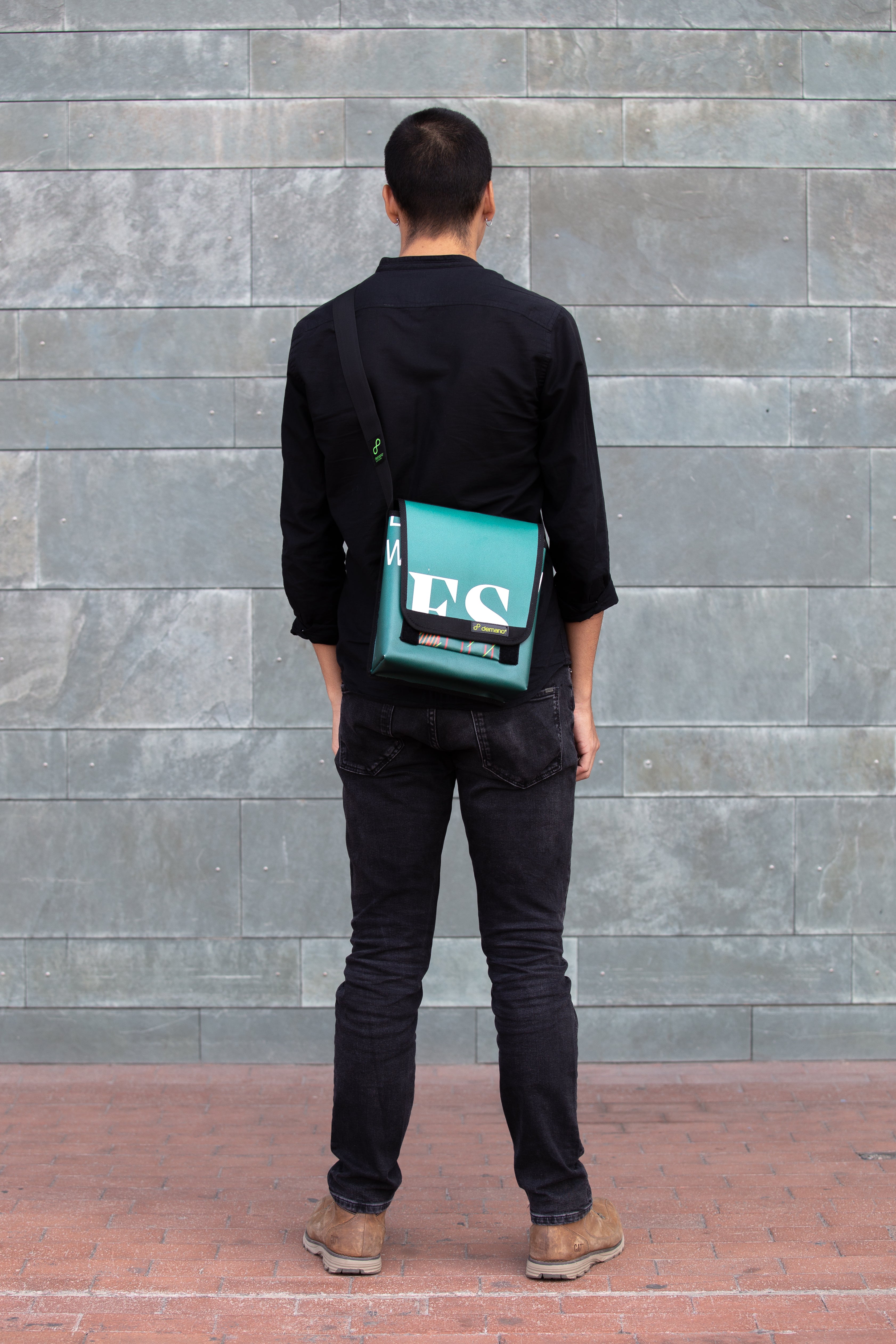 Está confeccionado con lona (PVC) de banderola que sirvió para difundir celebraciones y eventos especiales de la ciudad de Barcelona. Es impermeable, durable y super resistente.